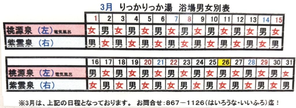 日頃より天然温泉「りっかりっか湯」をご利用いただき誠にありがとうございます。3月の浴場は、下記日程となります。お問合せは、『098-867-1126』はいろうな・いいふろ)迄!!!!